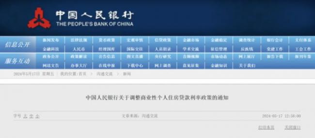 中国央行官网今(17)日中午发布《中国人民银行国家金融监督管理总局关于调整个人住房贷款最低首付款比例政策的通知》。 图:翻摄自中国央行